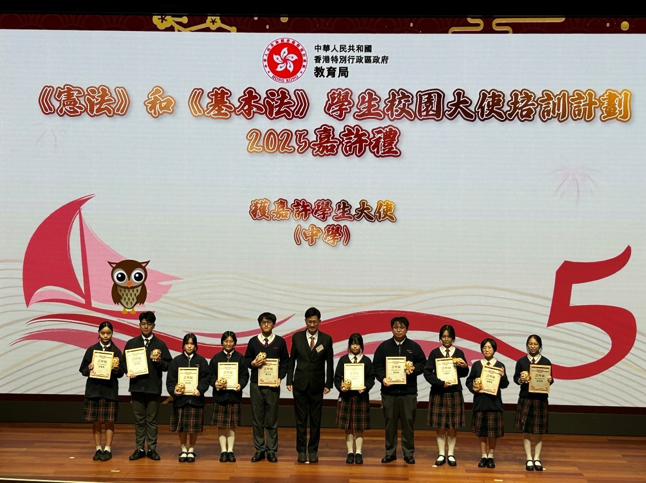 Congratulations to 6A CHOI WAI SEN, 5A TU YU FEI, 5B TO SANTINA TIN SUM, MA TSZ YAN, ZHOU WENBO, 5C NG YAN LAM, LAW KA YING, CHUNG HEI NGA, 5D TSE WAI CHIN, HUANG YILUN, 3B SO HEI LUI, 3C WONG YUEN TUNG were awarded with the Outstanding Constitution and Basic Law Student Ambassadors. Our school was awarded the "Award for Actively Organizing School-based Activities 2025".’
