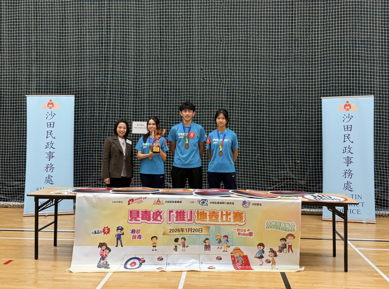 本校同學參加由沙田區撲滅罪行委員會、沙田民政事務處及沙田警區舉辦之見毒必「推」地壺比賽,運動員拼盡全力爭取佳績,奪得高級組季軍,隊員包括: