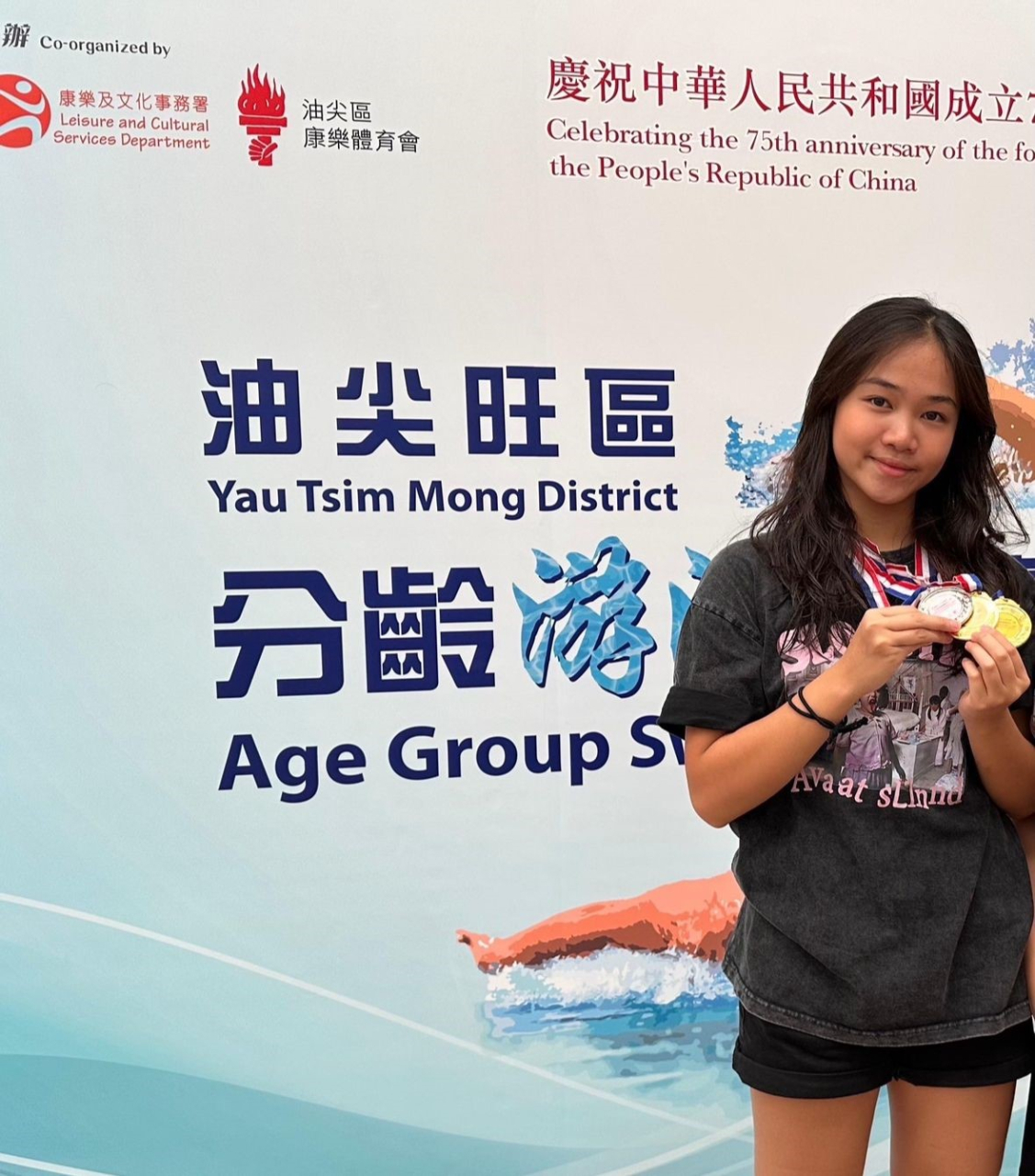 本校6C 簡君穎在油尖旺區分齡游泳比賽2024的女子青少年15至17歲組得到100米自由泳冠軍,50米蝶泳冠軍及50米自由泳亞軍。
