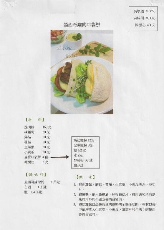 4B 吳穎儀 (22) , 4C 黃綺珊 (32), 4D 陳潔心 (2)墨西哥雞肉口袋餅